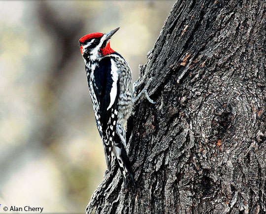 Adults are black on the back and wings with white bars; Adults have a red head and upper chest; Farther south in the mountains it is. 10 the forehead is coloured bright red in the male (and very occasionally yellow), and a lighter shade of red in the female. They have a white lower belly and they sometimes catch insects in flight;