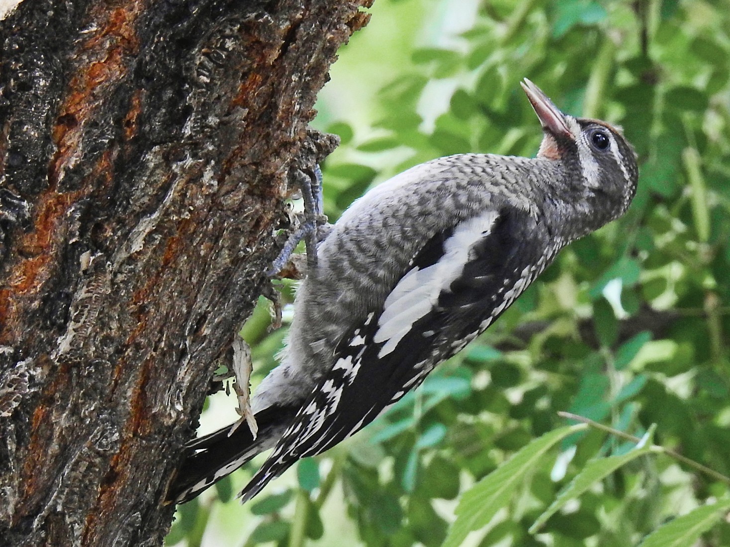 Yellow bellied sapsucker drumming on a bbq. Length about 20 22 cm; Adults are black on the back and wings with white bars; They have a white lower belly and rump. 22 cm (8) woods, orchards.